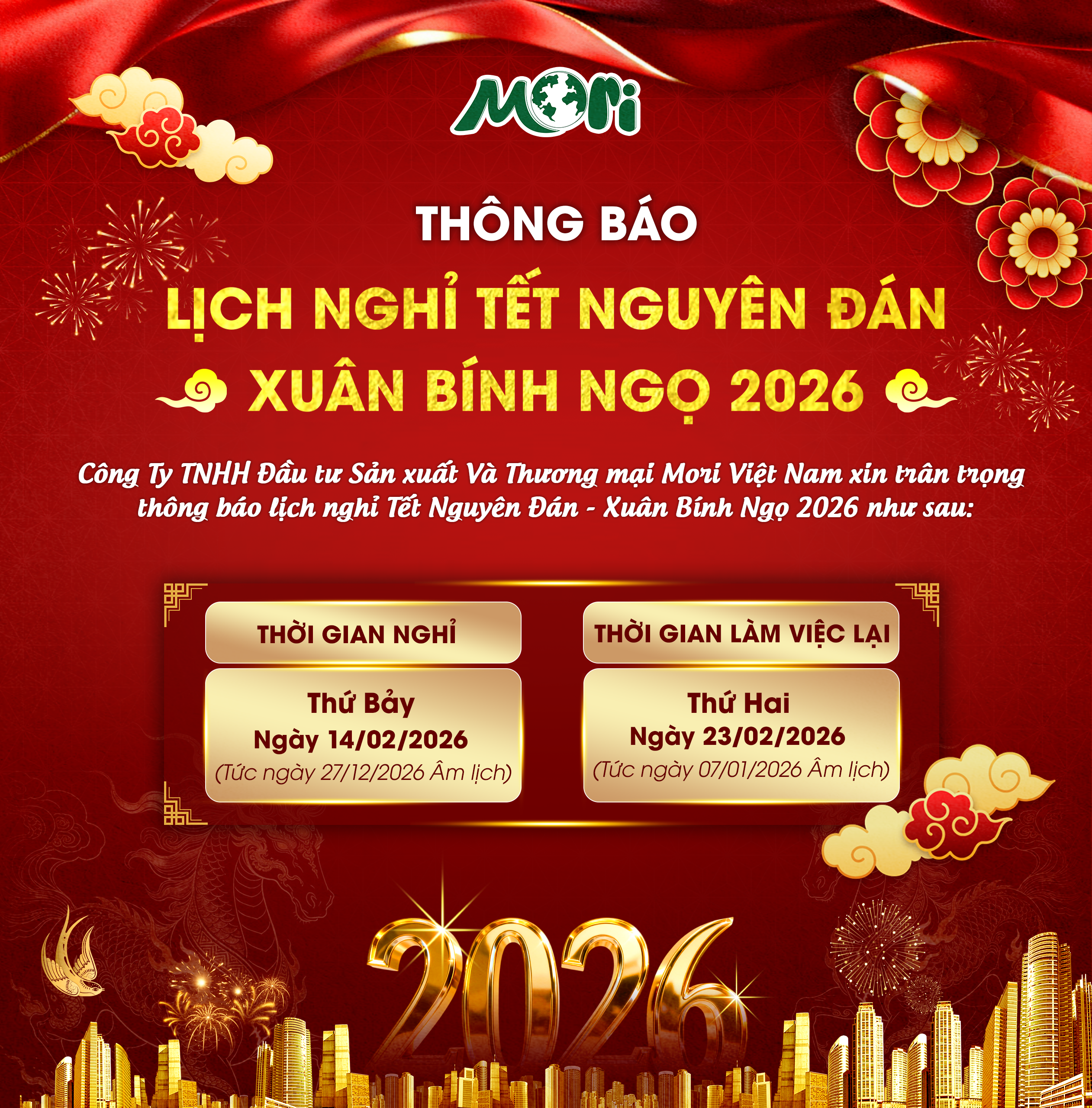 MORI VIỆT NAM THÔNG BÁO LỊCH NGHỈ TẾT NGUYÊN ĐÁN XUÂN BÍNH NGỌ 2026